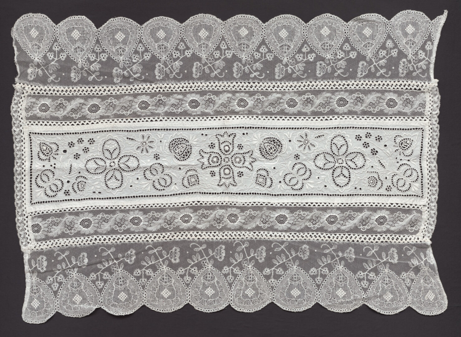 Biela prikrývka zošitá z viacerých častí. Strednú časť tvorí predkreslená výšivka vyšitá na bavlnenom batiste, techniky plný steh,dierky a gatre; nasleduje čipka strojová a výšivka na tyle ukončená do tvaru zaoblených zúbkov.