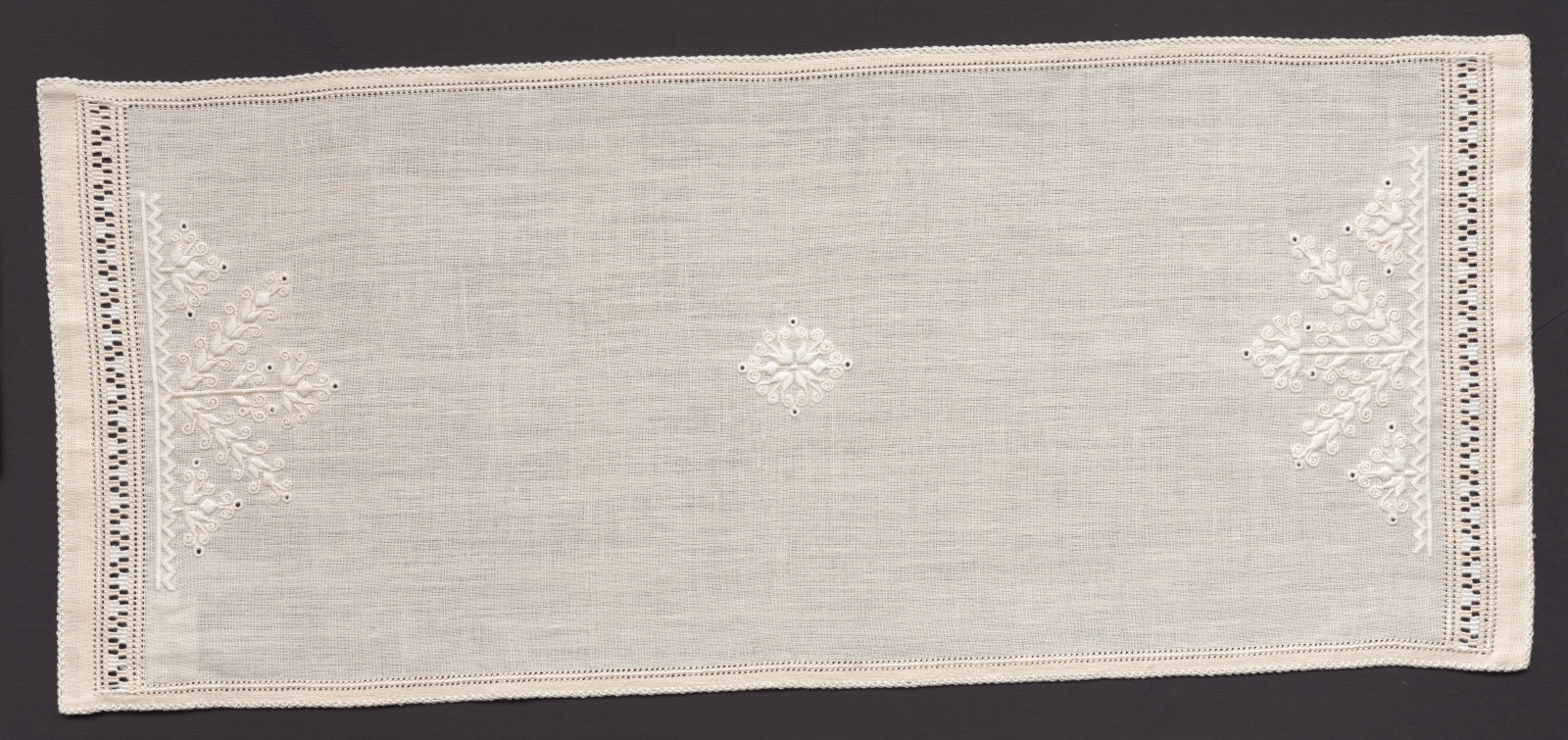 Vyšívana prikrývka – v strede a na koncoch kvetinové motívy vyšité bielou bavlnenenou niťou. Použité techniky: hladkovanie, stonkový steh, dierky. Konce prikrývky sú ozdobené ažúrkou a mriežkou, okolo celej prikrývky sú slučkované okrajové zúbky. Navrhla výtvarníčka Otília Kopecká, vyrobila majsterka ľudovej umeleckej výroby Margita Erniholdová. Lokalita: Záhorie.