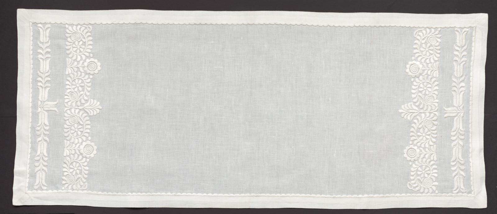 Prikrývka s predkreslenou čatajskou výšivkou. Rastlinné motívy sú vyšité plným plochým stehom bielou bavlnkou na ľanovom továrenskom plátne. Motívy sú voľnejšie, uložené na koncoch prikrývky. Predkreslila Katarína Kanišová, vyšila Irena Kipsová, Čataj.