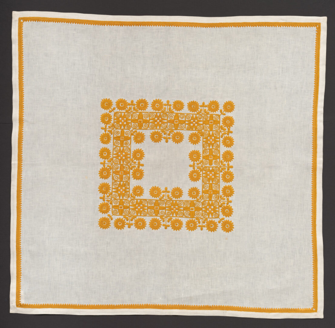 Vyšívaná prikrývka štvorcového tvaru. V strede a na okraji výšivka výšivky s rastlinnými a geometrickými motívmi. Prikrývka je zhotovená z ľanového plátna, výšivka je zhotovená oranžovými bavlnenými niťami. Použité techniky stonkový steh a plný plochý steh. Lokalita Záriečie.