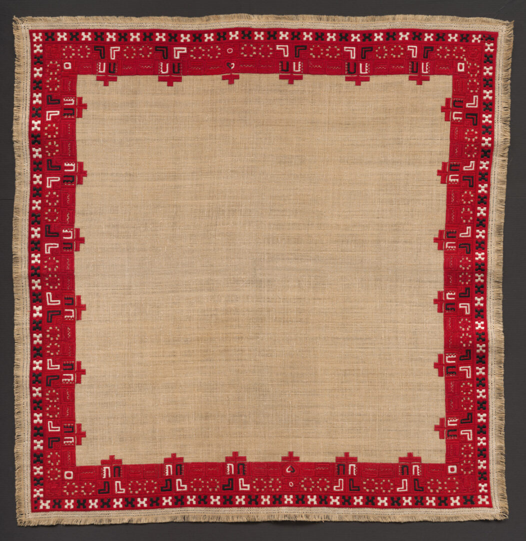 Vyšívaná prikrývka štvorcového tvaru. Základný materiál je režné konopné plátno po obvode vyšité výšivkou. Geometrické motívy sú prevzaté z rukávcov zo Šoporne, šité sú podľa počítaných nití šikmým stehom, perlovkou červenej, čiernej a bielej farby. Okraje prikrývky sú ozdobené mešterkou a ukončené krátkymi strapcami.