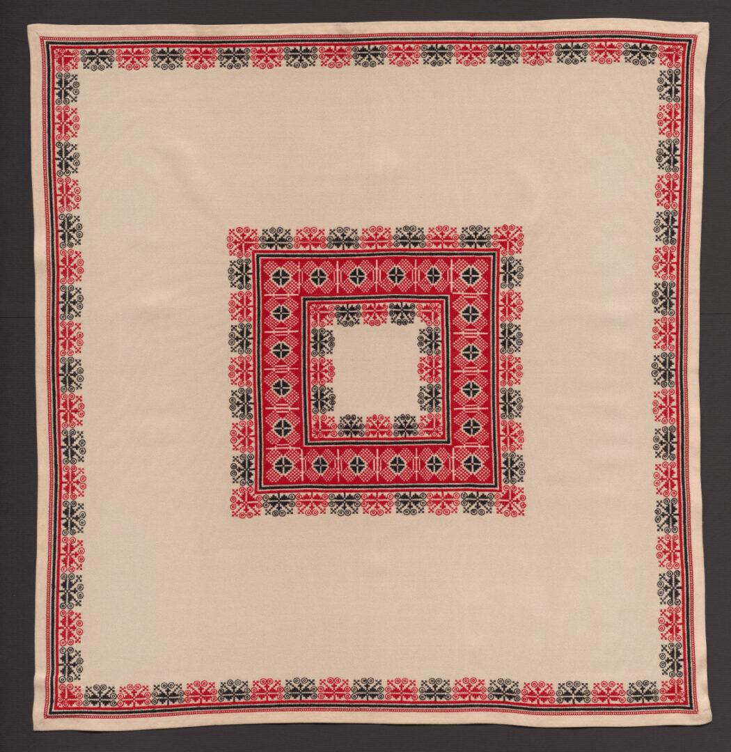 Prikrývka je zhotovená z hodvábneho plátna krémovej farby, v strede a po obvode vyšitá rôznymi geometrickými a rastlinnými motívmi čiernou a červenou bavlnkou. Použité stehy: kríž, vrkôčikový krížik, mešterka.
