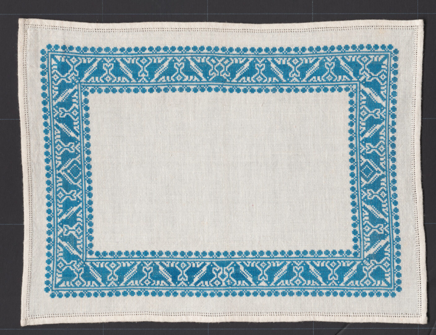 Vyšívaná prikrývka, biele ľanové plátno vyšité modrou mulinkou a bielou cvernou na šitie. Vyšívka je počítaná, stehy krížikový a mešterka, motív figurálny vtáči.