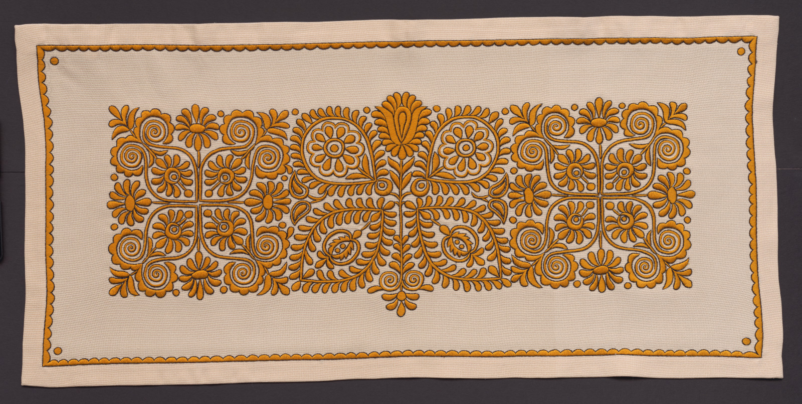 Prikrývka s predkreslenou čatajskou výšivkou. Rastlinné motívy sú vyšité plným plochým stehom okrovou farbou a kontúrované stonkovým stehom čiernou farbou. Motívy sú voľnejšie, uložené zrkadlovo po zvislej osi.