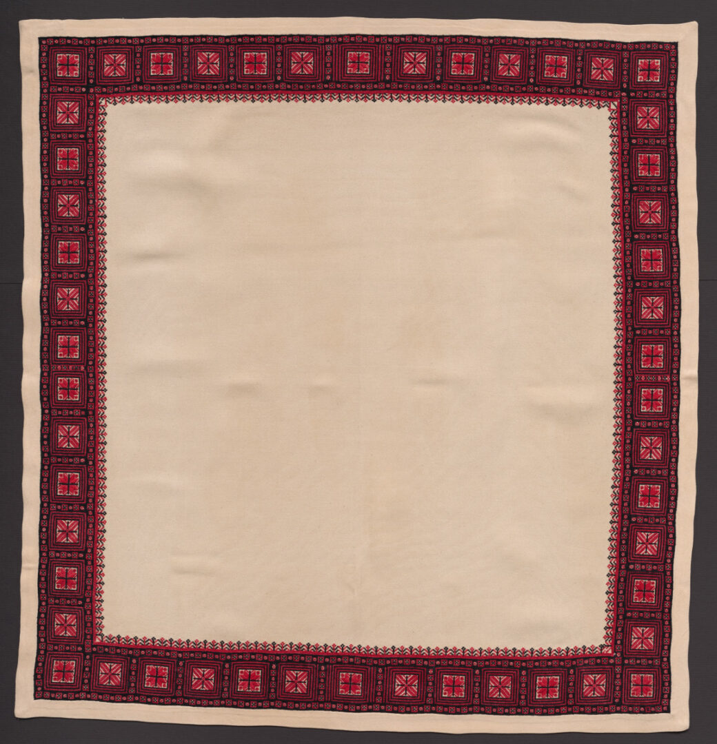 Prikrývka vyšívaná podľa vzoru zo ženského čepca z Polomky. Základný materiál je hodváb, priadza je bavlnená. Použité techniky sú krížikový steh a hladkovanie. Prikrývka bola odmenená I. cenou na súťaži k 50. výročiu KSČ.