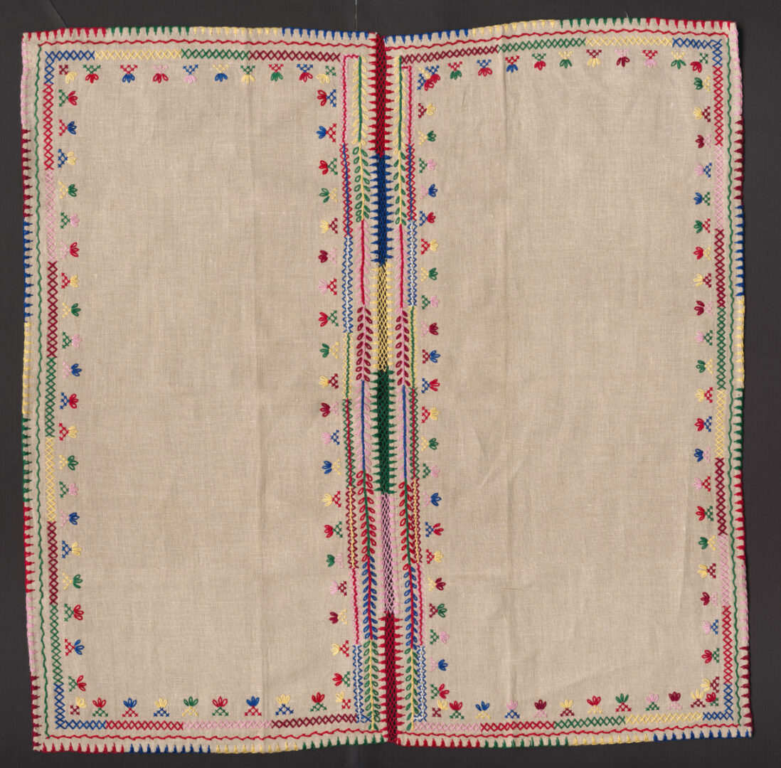 Prikrývka z dvoch kusov konopného továrenského plátna. Poly sú spojené ozdobných spojovacím švíkom, okraje sú ozdobne vyšité farebnými bavlnkami. Steh krížikový a slučkovací.