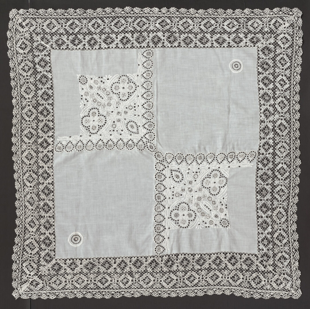 Biela prikrývka zložená z výšiviek a čipiek. Výšivky sú zo šatiek na hlavu z okolia Trnavy, čipka je kápková zo Španej Doliny. Vyšité na bavlnenom batiste, výšivka predkreslená, na obnitku, naplno, slučky, dierky a gatre. Čipka plátenko, dierky, hrubá niť.