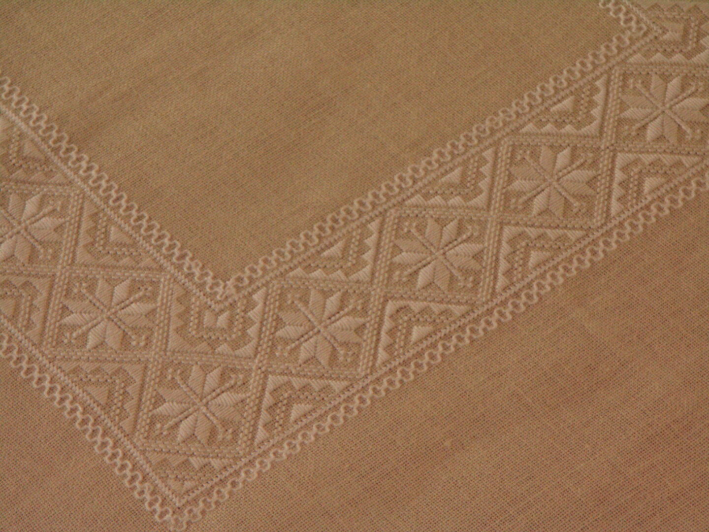 Prikrývka je vyšívaná na továrenskom ľanovom plátne s pravideľnou osnovou farebnými perlovkami. Ornamentiku horehronskej výšivky charakterizujú geometrické motívy, v ktorých dominujú kosoštvorce vyšívané rôznofarebnými priadzami. Uplatňujú sa nové jednoduchšie aj náročnejšie techniky vyšívania. Obyčajný aj vrkôčikový krížik, hladkovanie, výrez a hrachovinka predstavujú základné techniky v horehronskej výšivke. Okrem nich sú zastúpené mnohé ďalšie, napr. krkovička ,mešterka retiazky a krivinka.