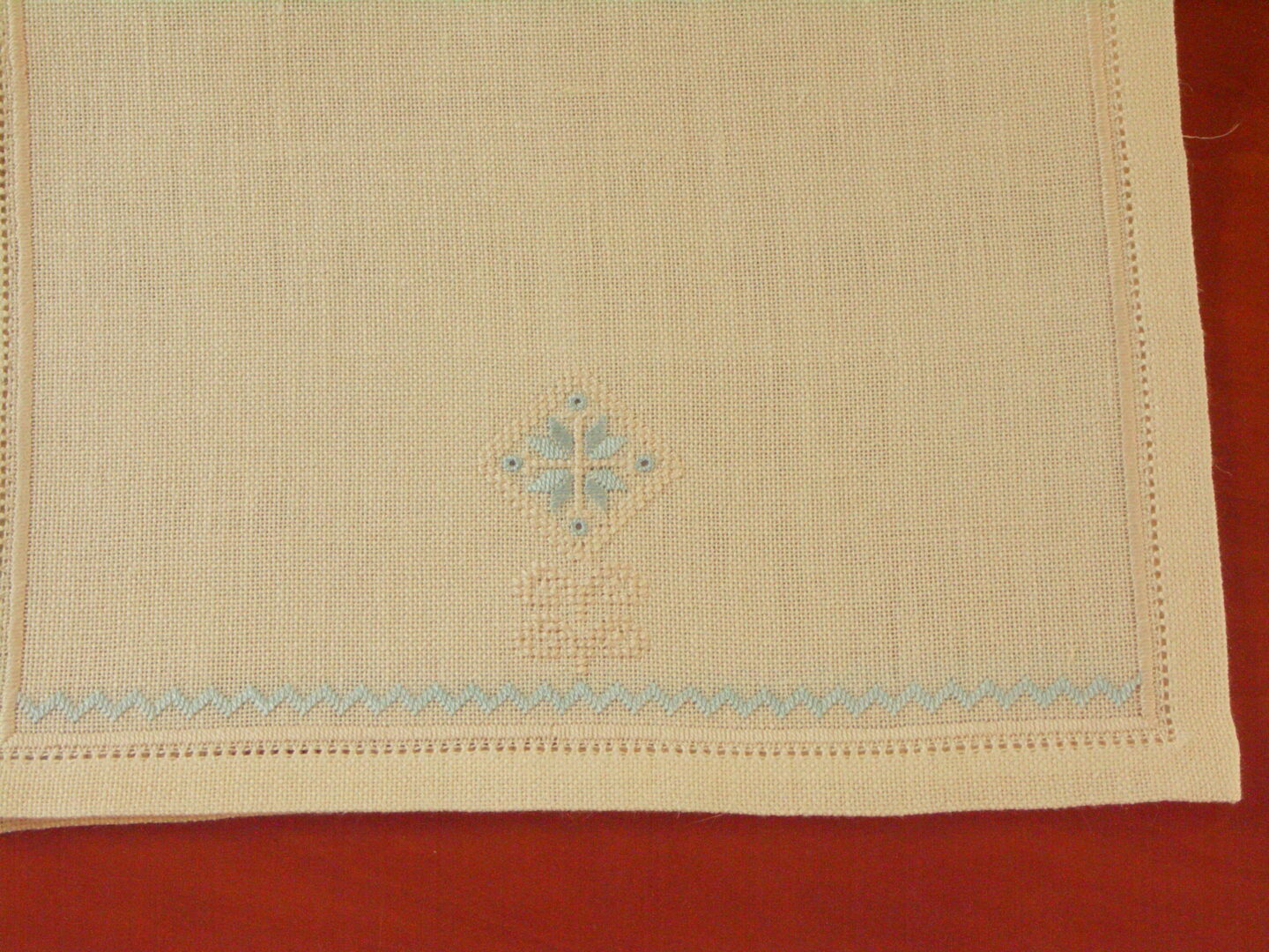 Prikrývka je vyšívaná na továrenskom ľanovom plátne s pravideľnou osnovou farebnými perlovkami. Ornamentiku horehronskej výšivky charakterizujú geometrické motívy, v ktorých dominujú kosoštvorce vyšívané rôznofarebnými priadzami. Uplatňujú sa nové jednoduchšie aj náročnejšie techniky vyšívania. Obyčajný aj vrkôčikový krížik, hladkovanie, výrez a hrachovinka predstavujú základné techniky v horehronskej výšivke. Okrem nich sú zastúpené mnohé ďalšie, napr. krkovička , mešterka reťiazky a krivinka.
