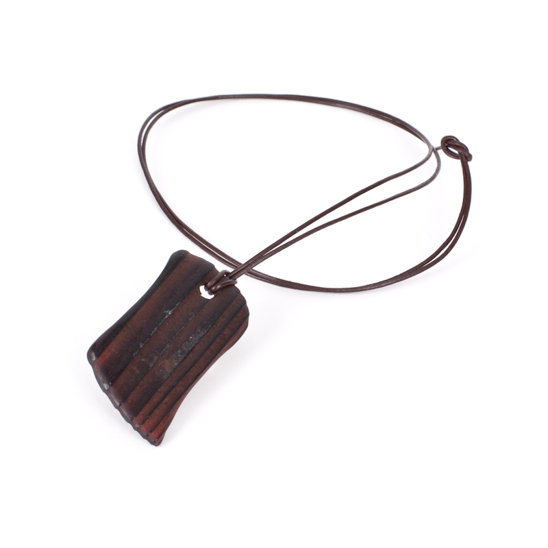 Prívesok drevený na dlhom koženom remienku má rôzne tvary a je reliéfne vybrusovaný. Je vyrobený z ihličnatých drevín a morený.