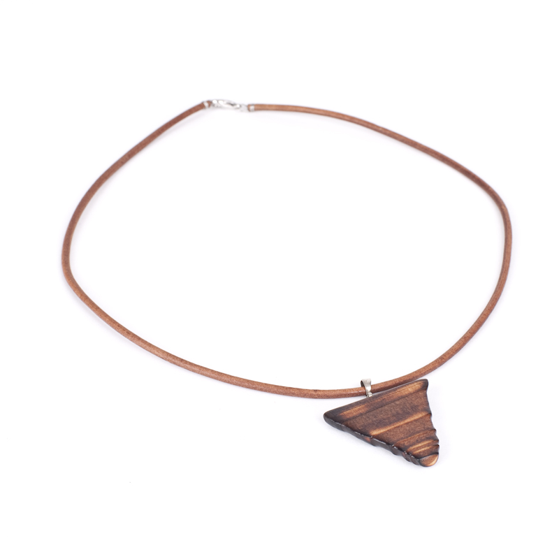 Prívesok drevený na koženom remienku má rôzne tvary, je reliéfne vybrusovaný a morený. Je vyrobený z ihličnatých drevín.