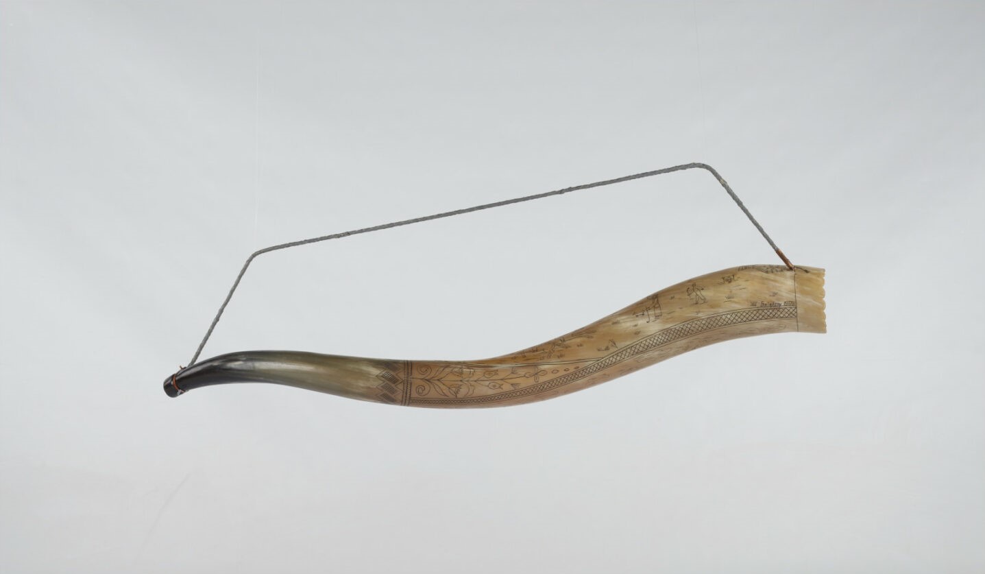 Roh hlásny – zhotovený z kravského rohu, pôvodný špirálovito zatočený tvar, hladký, ústie vlnovkovito zarezané. Výzdoba drobnou kontúrovou černenou rezbou s jednoduchým poľovníckym výjavom. Na užšom konci nasadený rohovinový náustok (nátrubok).