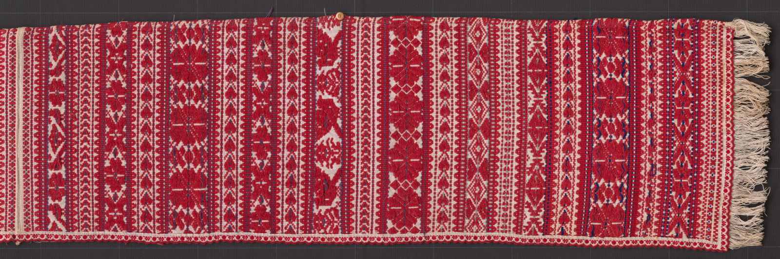 Utkaný je plátnovou a ripsovou väzbou, vzory sú vytvorené preberaním. Z troch strán sú našité textilné zúbky, štvrtá strana je obrúbená strojom. Na dvoch koncoch sú nechané strapce z osnovy tkaniny.