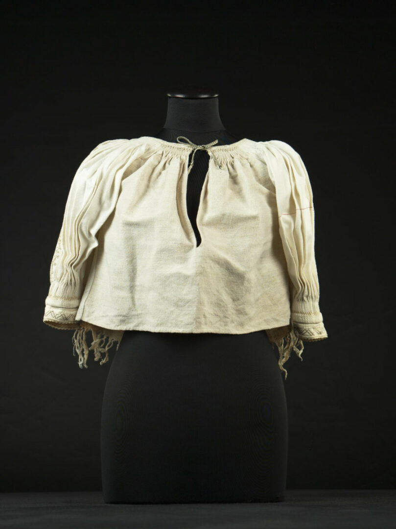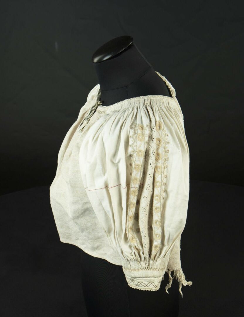 Rukávce sú ušité z viacerých druhov plátna. Rukávy sú z domáceho bavlneného, zadná časť z konopného a predná zo zmiešaného (bavlna + konope). Zadná čast má dolný okraj vystrapkaný. V strede rukávov je po dĺžke všitá paličkovaná čipka z hrubších bavlnených nití. Pozdĺž všitej čipky je z oboch strán urobená výšivka krivou ihlou. Horná časť rukávcov je nariasená a všitá do úzkeho golierika, na ktorom je vyšitá krivinka. Konce rukávov sú nariasené a všité do manžety z bavlneného vzorovaného plátna, cez ktoré je urobené štepovanie strojom. V hrane manžety je všitá hadovka. Golierik sa uväzuje cigánskymi tkanicami.