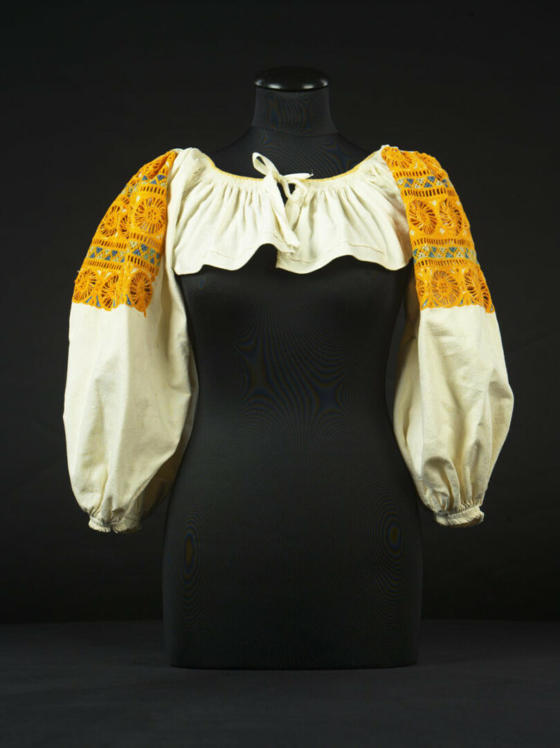 Rukávce sú z pamokového domáceho plátna. V hornej časti rukávov majú umiestnenú výšivku. Šitá je krivou ihlou. Výšivka je výrezová, s kruhovými motívmi. Úzky golierik je vyšitý krížikmi.Konce rukávov sú naskladané, sklady sú spevnené našitým úzkym pásikom plátna.