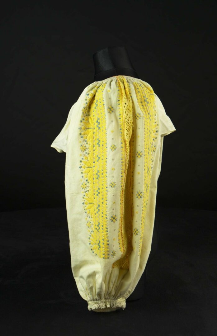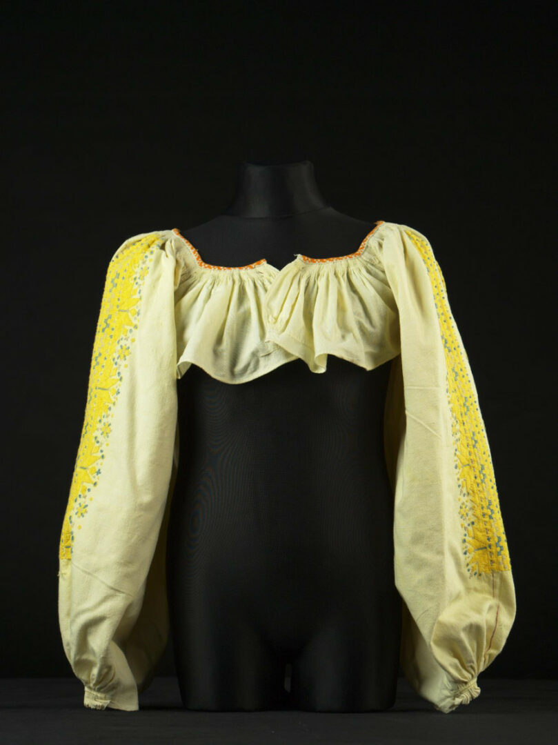 Rukávy rukávcov sú z domáceho plátna, výzdoba je umiestnená po ich dĺžke. V strede je všitá paličkovaná, mnohopárová čipka. Z oboch strán čipky je výšivka krivou ihlou, šitá je bavlnenou priadzou. Golierik je vyšitý krížikmi oranžovou farbou. Konce rukávov sú naskladané a spevnené našitým pásikom plátna.