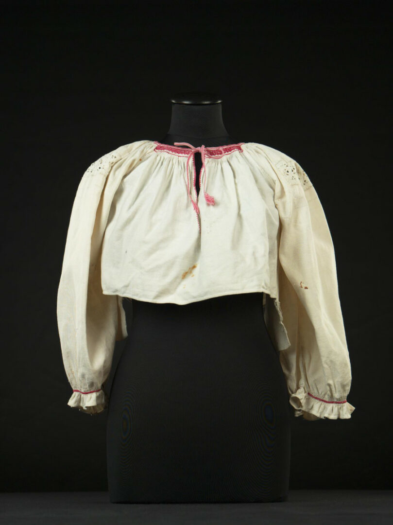 Ušité sú z domáceho plátna, rukávy z ľanového, drieková časť z bavlneného. V hornej časti rukávov je horizontálne všitá paličkovaná čipka. Všívaná je do plátna pomocou spojovacieho švíka. Úzky golierik je vyšitý krížikmi červenou vyšívacou priadzou. Riasenie na koncoch rukávov je spevnené krokvičkou a riasenie na prednej časti je tiež spevnené výšivkou.Ku golieriku sú prišité šnúrky robené ručne na piatich prstoch.