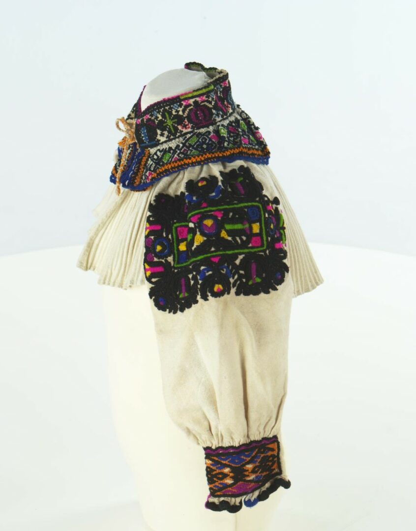Ušité sú z domáceho plátna. Pomerne široký stojatý golierik je vyšitý krížikmi. Na vrchnej časti rukávov je predkreslená výšivka. Dolná časť je nariasená a spevnená výšivkou. Ku golieriku je prišité okružie, vyšitá sieťovaná čipka, na okraji lemovaná modrou hadovkou. Sieťovina je z hrubej bavlnenej priadze. Výšivka na rukávcoch je šitá vlnou. Ku golieriku sú prišité dva páry pletencov na uväzovanie.