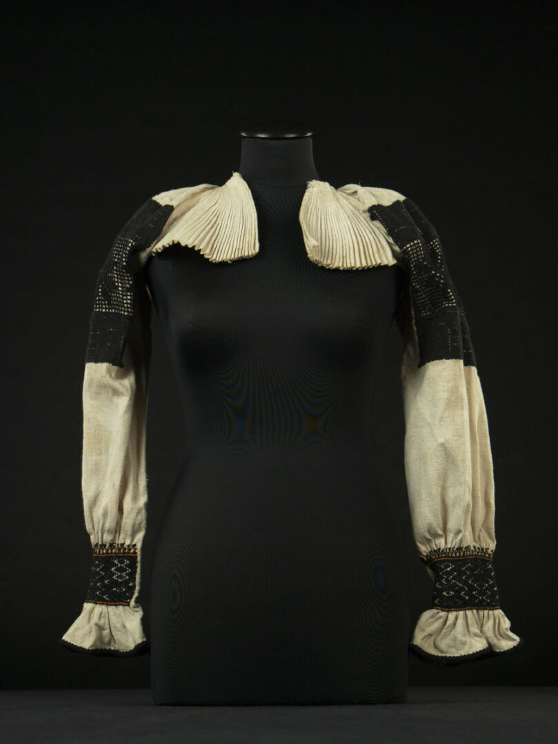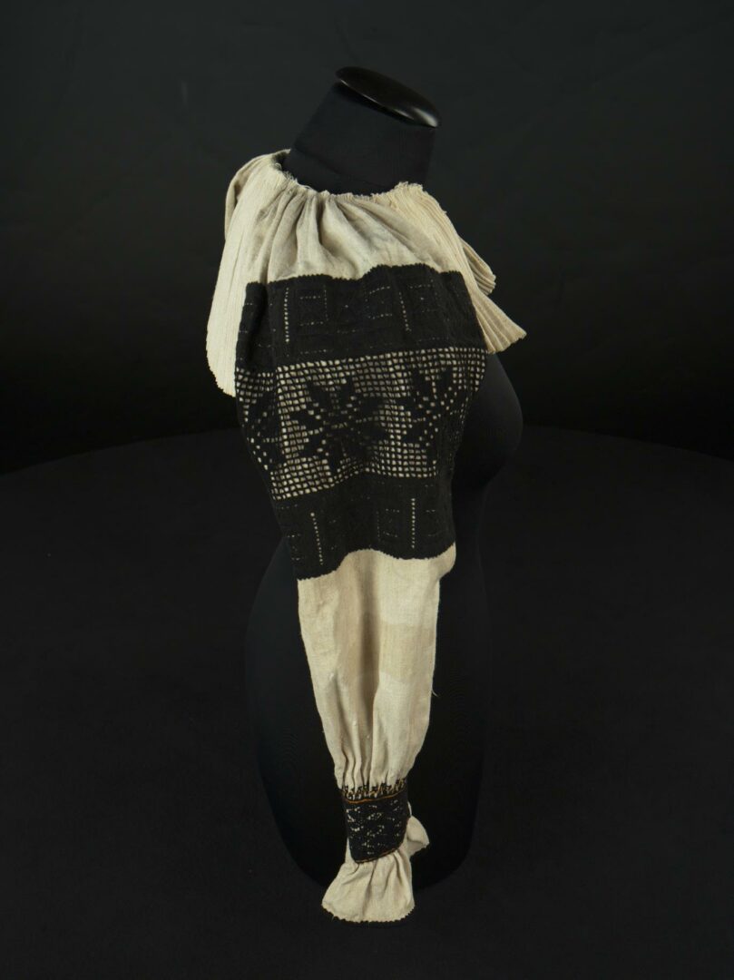 Rukávy sú z konopného plátna, predný a zadný stan z miešaného /konopno – bavlneného/. Na rukávoch je umiestnená háčkovaná čipka a výšivka. Výšivka dopĺňa našitú háčkovanú čipku z oboch strán. Použitý je úsporný plný steh. Nariasená dolná časť rukávov je spevnená výšivkou. Na vyšívanie je použitá hrubá bavlnená niť. Rukávce sú nekompletné, golierik je odpáraný.
