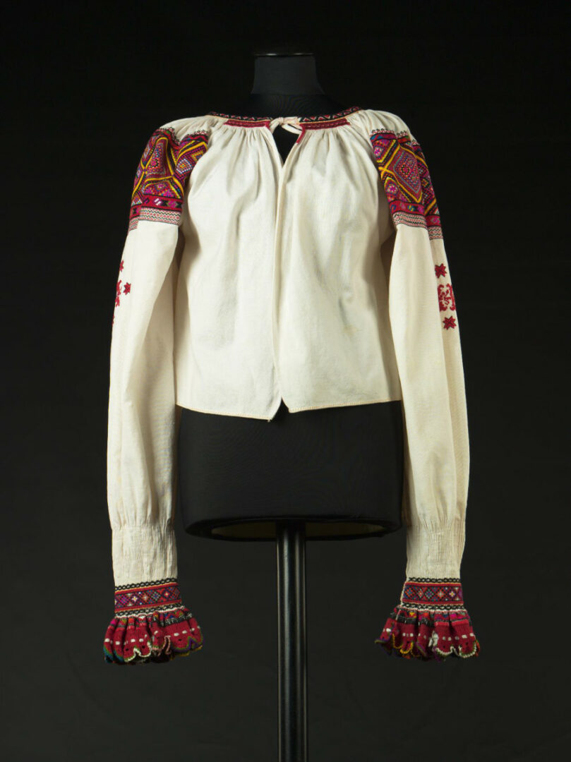 Rukávce sú ušité z domáceho plátna. Na rukávoch a golieriku sú vyšité podľa počítania nití pestrými perlovkami. Použité stehy: formovanie, krížik, hladkovanie, mešterka, krivinka. Rukávy sú v dolnej časti nariasené, cez riasenie je našitý pásik výšivky. Riasenie je spevnené výšivkou. Rukávy sú ukončené našitou háčkovanou čipkou z hrubej vínovočervenej bavlnenej priadze. Horná časť rukávcov je nariasená a všitá do golierika. Aj riasenie na prednej časti je spevnené výšivkou.