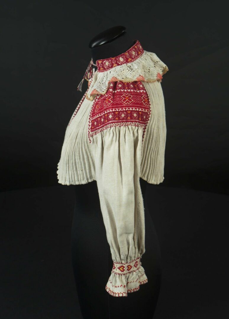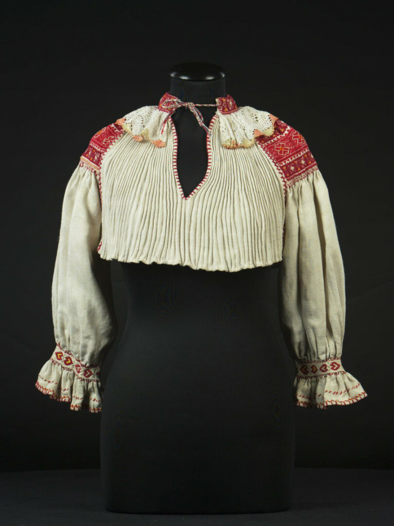 Ušité sú z domáceho ľanového plátna. Drieková časť je nariasená a spojovacím švíkom zošitá s rukávmi. Výšivka na prieramkoch a golieriku je robená podľa počítania nití /krížik, slučkovací steh/. V strede výšivky na prieramkoch rukávov je všitá červená továrenska tkanica. Nad spodným okrajom rukávov je výšivka cez riasenie. Ku golieriku je prišitá mnohopárová paličkovaná čipka. Na koncoch golierika sú pletence z bielej, modrej a červenej priadze.