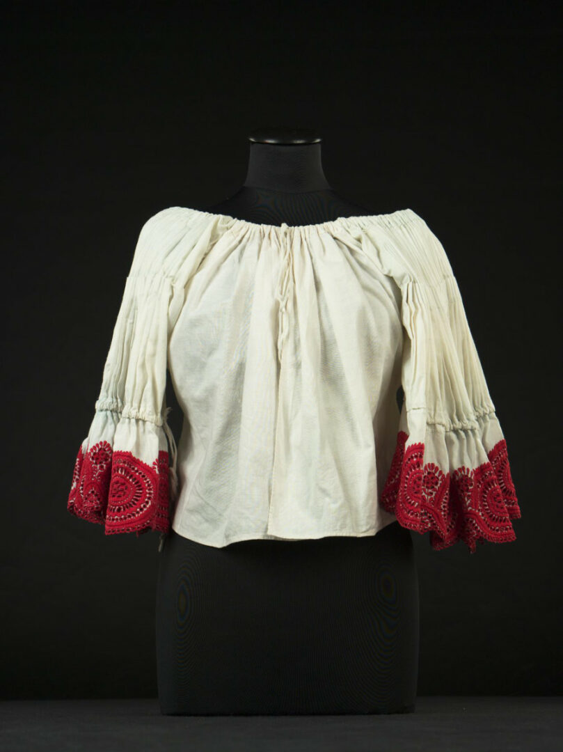 Rukávce sú z továrenského plátna. K dolnému okraju rukávov je prišitý pás s dierkovou výšivkou. Výšivka je šitá bavlnenou priadzou, plným plochým stehom, obnitkou, slučkovacím stehom. Horná časť rukávcov má ušitý prehyb, v ktorom je navlečená šnúrka na stiahnutie okolo krku. Rukávy sú naskladané do záhybov. Rukávce boli kúpené od : Júlia Mondočková, Močenok č.d. 417