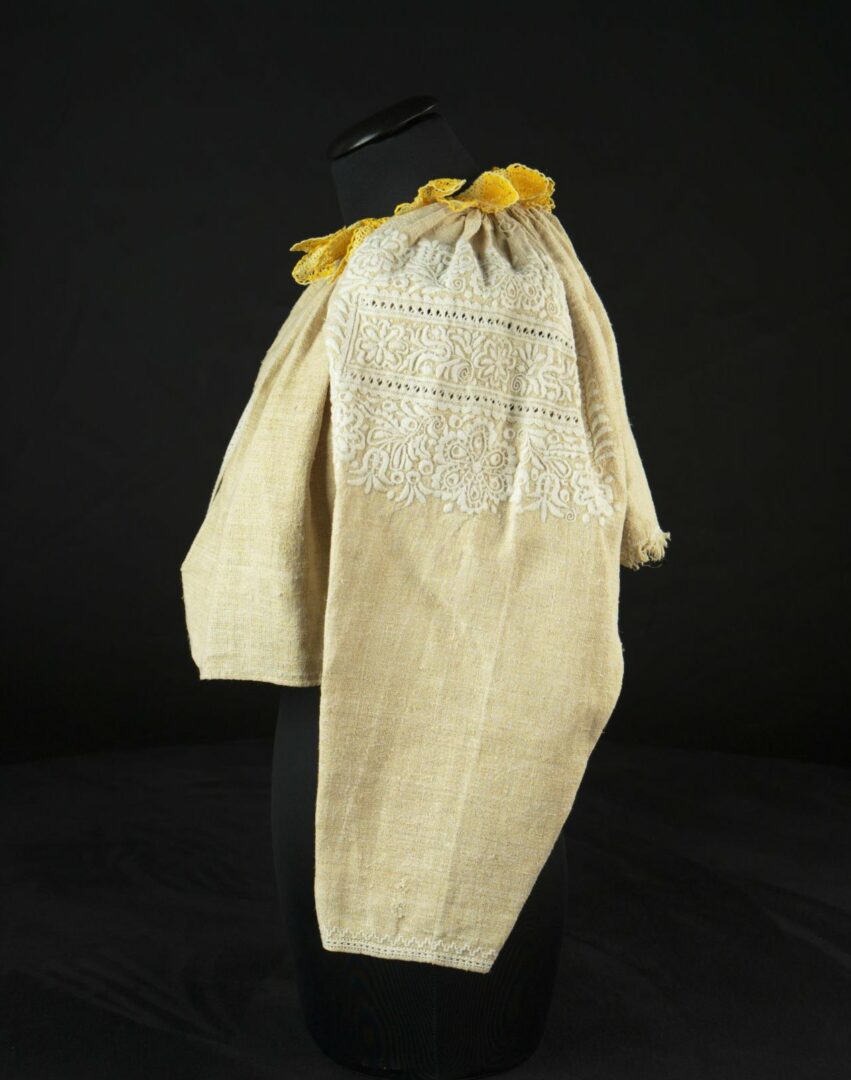 Rukávce z konopného plátna majú na rukávoch a na ľavej strane rázporka výšivku. Na rukávoch je rastlinný ornament zložený z troch pásov, ktoré oddeľuje pás hladkovania, hrachovinky a vyšitých zúbkov. Predkreslený rastlinný ornament je vyšitý plným plochým a stonkovým stehom. Pozdĺž rázporka je na jednej strane pás hrachovinky a jednoduchého hladkovania. Ku golieriku je prišitá háčkovaná čipka s dlhými zubami. Pravdepodobne bola prišitá dodatočne.