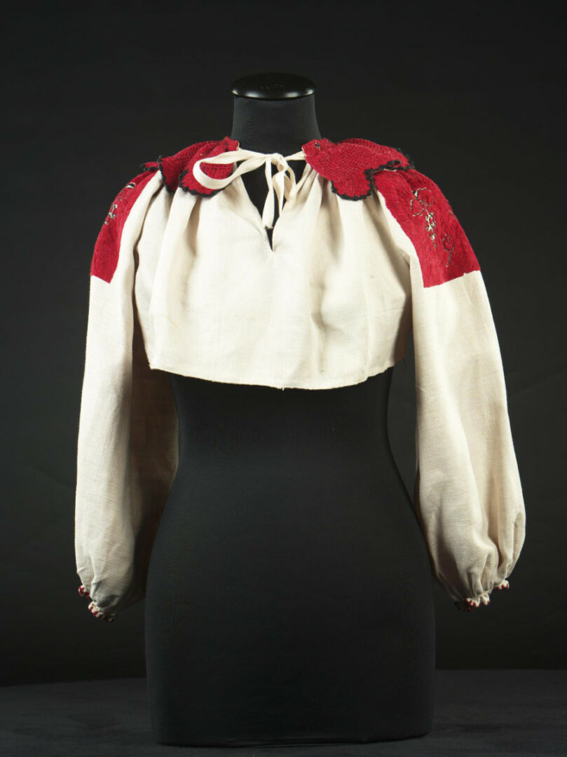 Rukávce sú ušité z domáceho ľanového kepru. Na hornej časti rukávov je výšivka šitá hrubšou bavlnenou priadzou. Kompozícia je vyšívaná plným úsporným stehom, niektoré motívy sú konturované stonkovým stehom čiernou priadzou.Golierik je vyšitý vrkôčikovým krížikom. Ku golieriku je prišité háčkované okružie. Konce rukávov sú obslučkované. Nad dolným okrajom sú rukávce nariasené, riasenie je spevnené dvomi radmi retiazky.