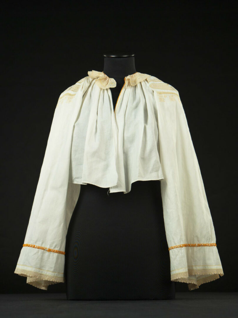 Rukávce sú z tenkého továrenského plátna.Na rukávoch majú výšivku bavlnenou a nezosúkanou hodvábnou priadzou. Bavlnou sú ušité dve linky ažúrky, medzi nimi je všitá paličkovaná čipka. Okraje kompozície tvorí predkreslená výšivka hodvábom.Okraj golierika má v hrane vyšité zúbky a pod nimi je prišité čipkové okružie. Je z paličkovanej čipky. Úzka čipka je prišitá aj na koncoch rukávov. Na okraji zadného dielu je hrubšou bavlnou vyšitá linka krokvičky. Krokvička je ušitá aj 8 cm od okraja rukávov, je v nej navlečená šnúrka na stiahnutie.