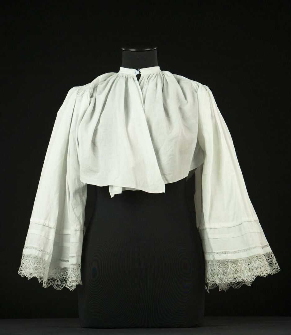 Rukávce sú ušité z vaperu. Konce rukávov sú zapracované ažúrkou a k ich okraju je prišitá paličkovaná vláčková čipka. Nad ažúrkou je ušitý zámik a nad nim je prehyb na navlečenie šnúrky, ktorou sa rukáv stiahol.