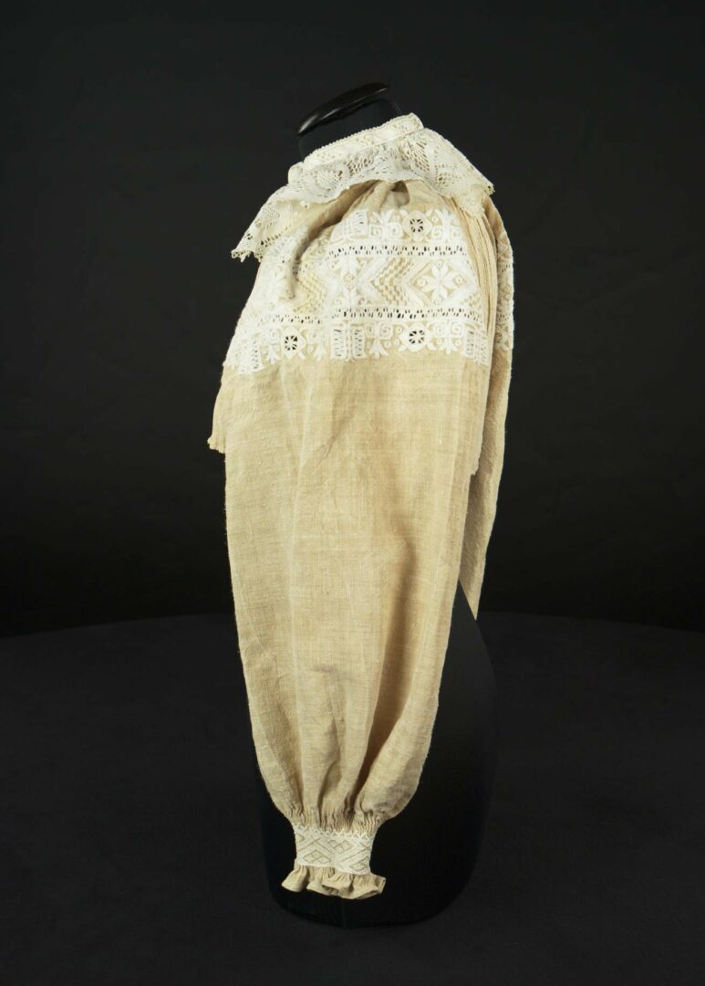 Rukávce sú ušité z domáceho konopného plátna. Na rukávoch a golieriku sú ozdobené výšivkou. Je šitá podľa počítania nití. Použité stehy: hladkovanie, formovanie, hrachovinka, gatry, slučkovací steh. Konce rukávov sú nariasené, riasenie je spevnené výšivkou. Zadná časť rukávcov je zošitá s rukávmi spojovacím švíkom. Na vyšívanie je použitá hrubšia bavlnená priadza. Ku golieriku je prišité okružie z bavlnenej továrenskej čipky. Drieková časť je ručne riasená.