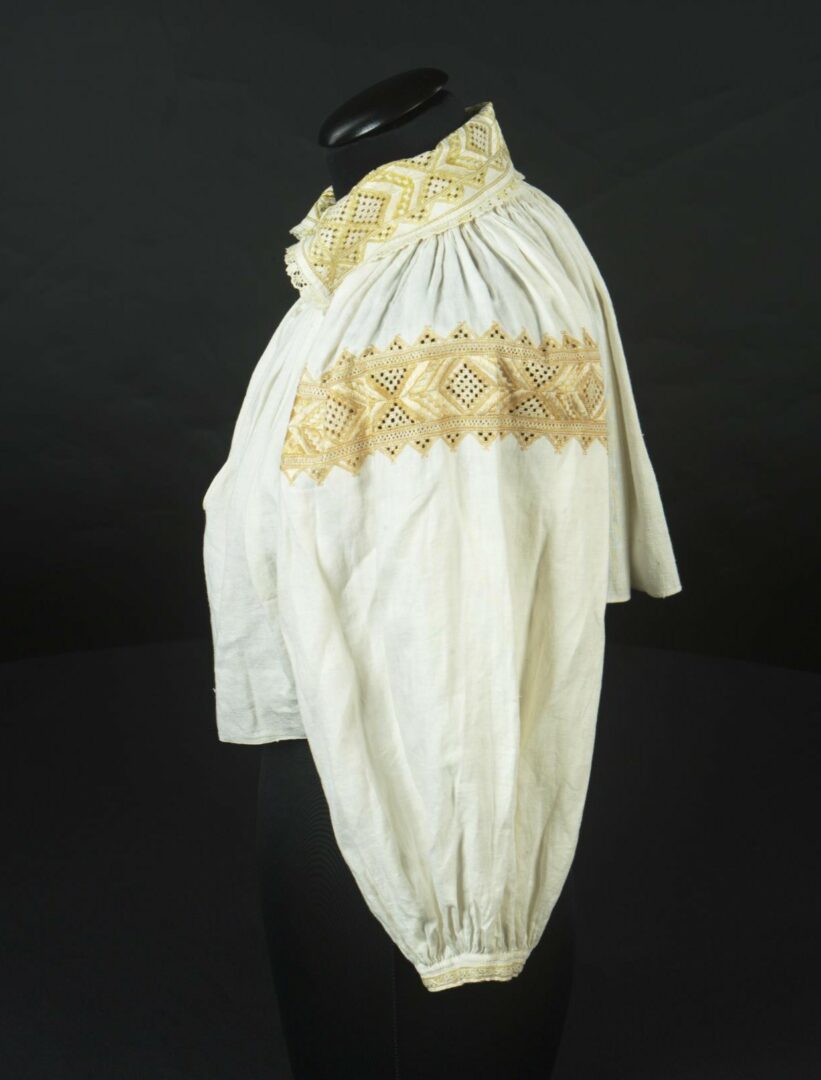 Ušité je ručne z ľanového šifónu. Výšivka podľa počítania nití je urobená hodvábnou niťou. Umiestnená je na rukávoch, golieri a úzkej manžete. Použité stehy: hladkovanie, formovanie, ažúrka,výrez, mešterka. Úzka paličkovaná čipka je našitá okolo goliera a okolo rázporka na prednom diele.