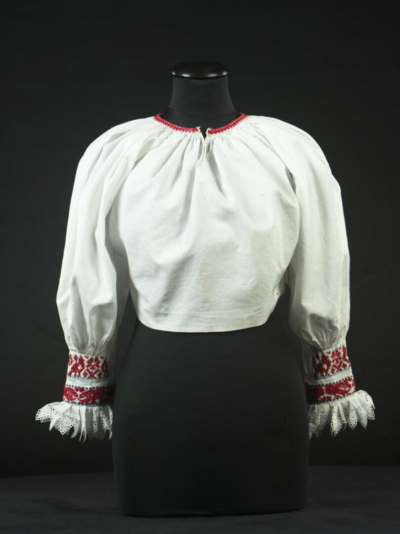 Rukávce sú ušité z továrenského plátna. Obalky a golierik sú z tkaniny s preberaným červeným vzorom. Na prednej časti a na rukávoch je riasenie spevnené výšivkou. Výšivka je šitá hrubou červenou priadzou. K obalkom rukávov je prišitý volán z bielej strojovej výšivky.