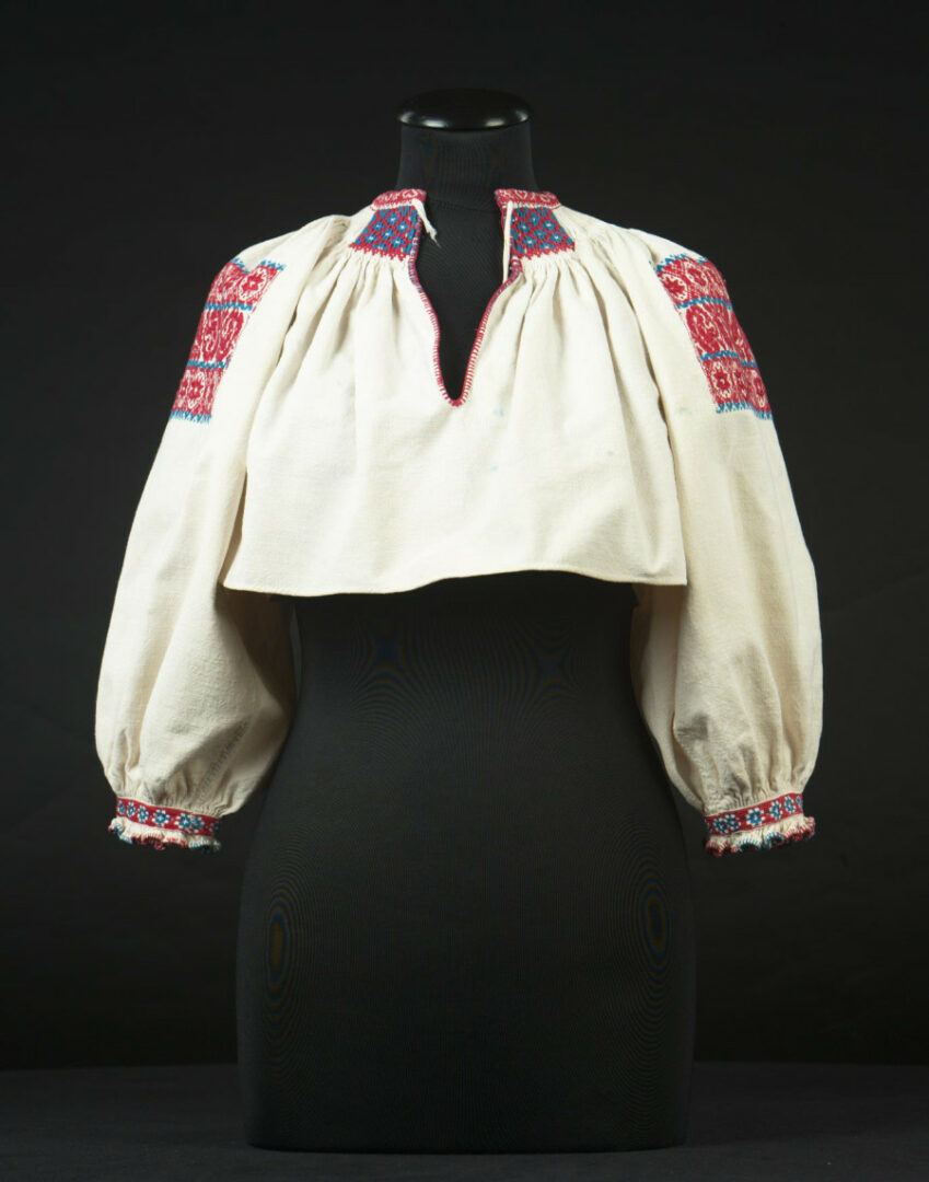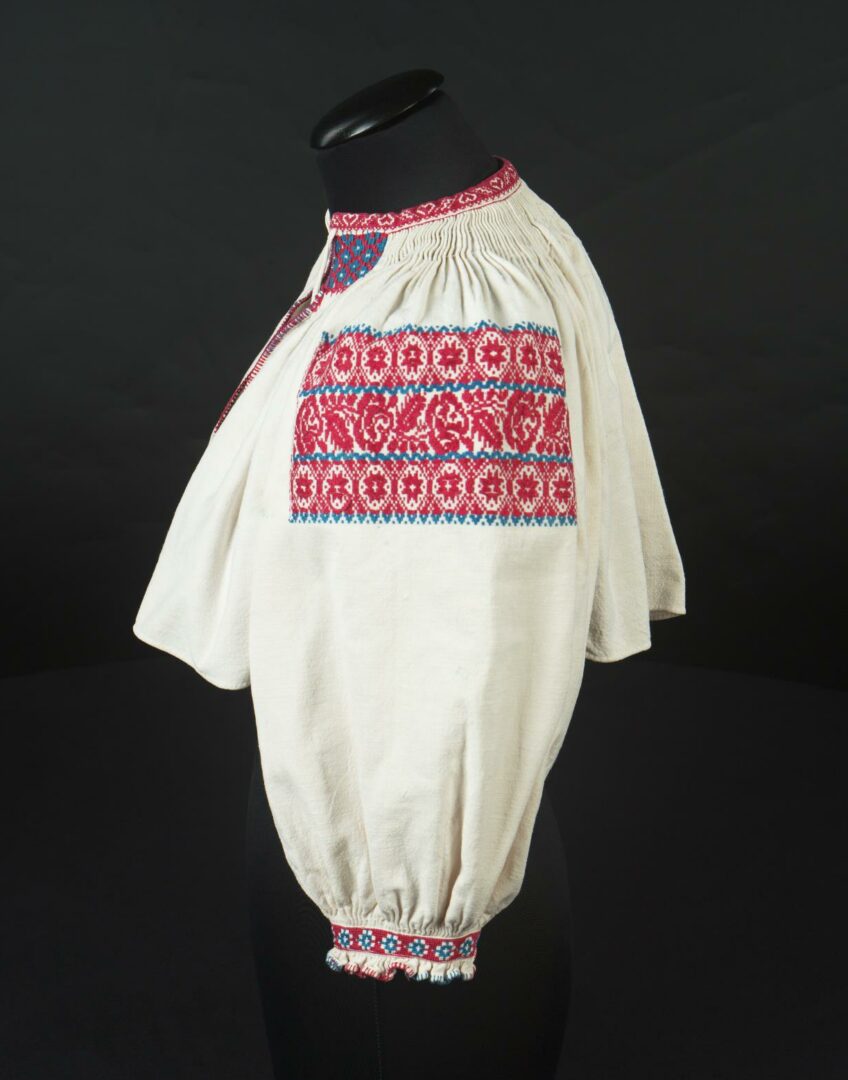 Rukávce sú ušité z domáceho bavlneného plátna, na hornej časti rukávov majú ozdobné pretkávanie červenou a modrou perlovkou. Golierik a pásik plátna našitý na dolnej časti rukávov, sú vyšité krížikmi. Riasenie na prednej časti pod golierikom je spevnené výšivkou, ktorá je šitá slučkovacím stehom. Okraje rukávov a rázporok sú obslučkované.