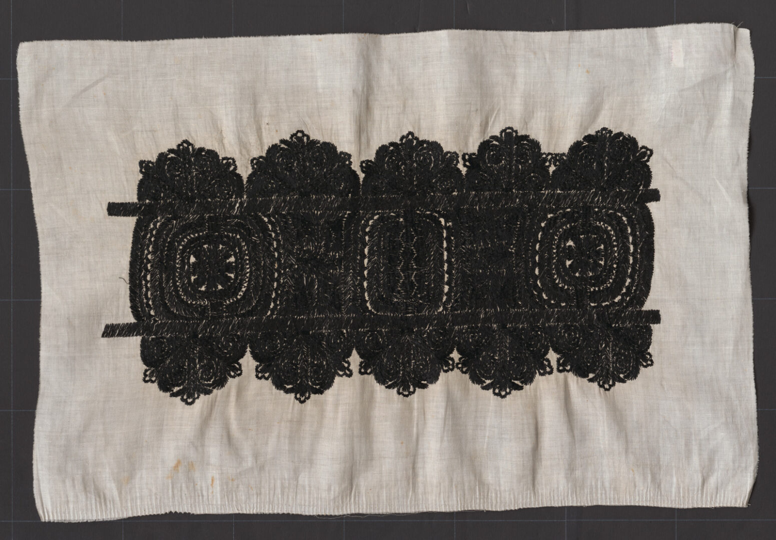 Rozpárané rukávy z rukávcov sú vyšíté úsporným plochým stehom. Ako vyšívacia priadza je použitý neskrúcaný čierny hodváb.