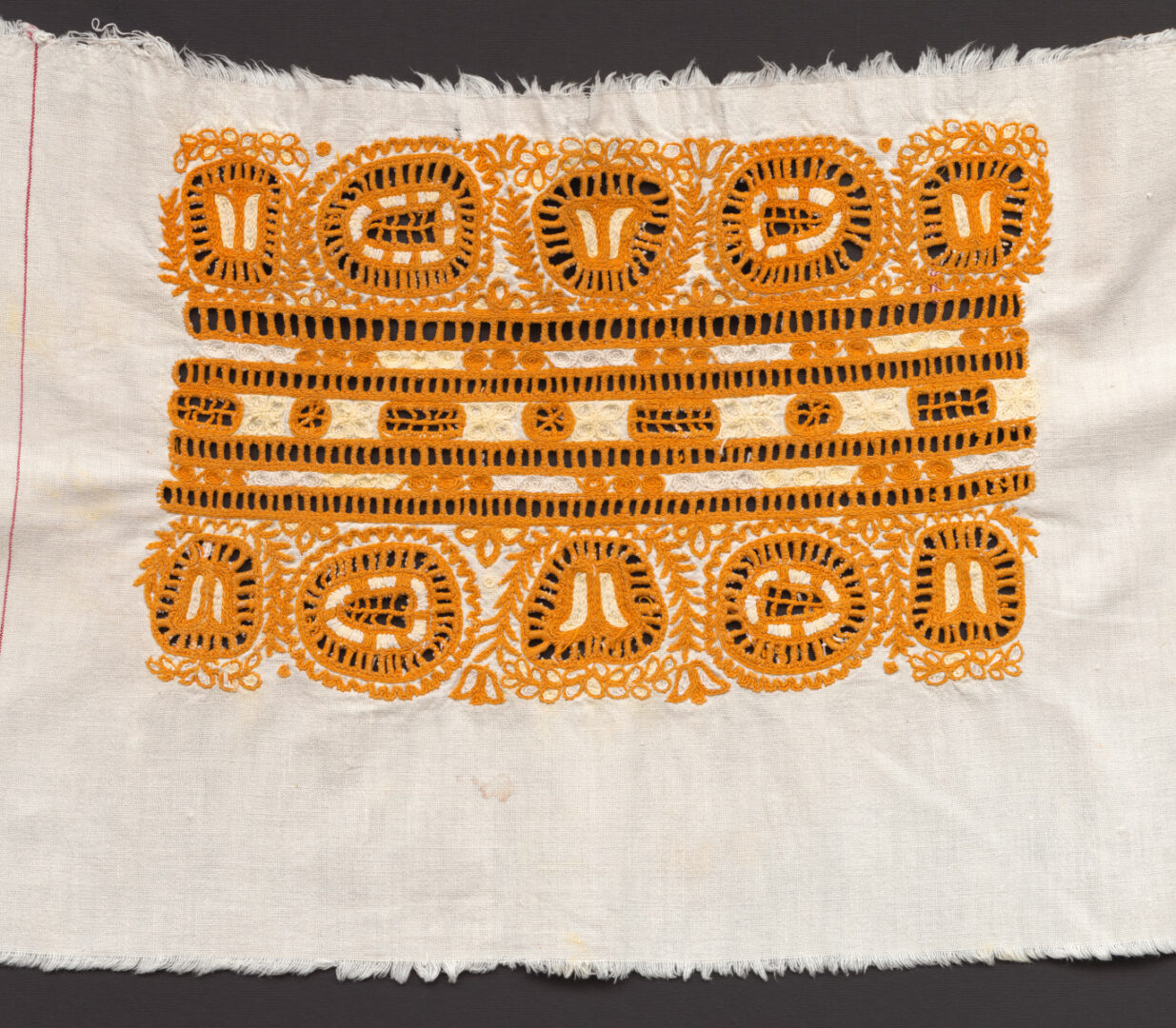 Rukáv má v hornej časti výšivku krivou ihlou. Motívy vyšité hustou retiazkou sú doplnené výrezom.
