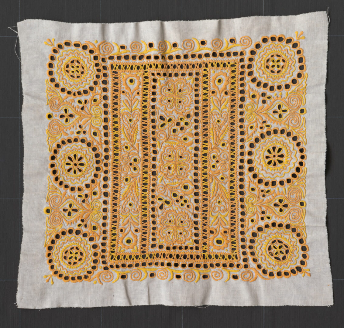 Výšivka je robená na továrenskom plátne. Predkreslený ornament je členený linkami hrachovinky. Výšivka je šitá hrubšou bavlnenou priadzou, tvoria ju dierky a motívy šité plným stehom.