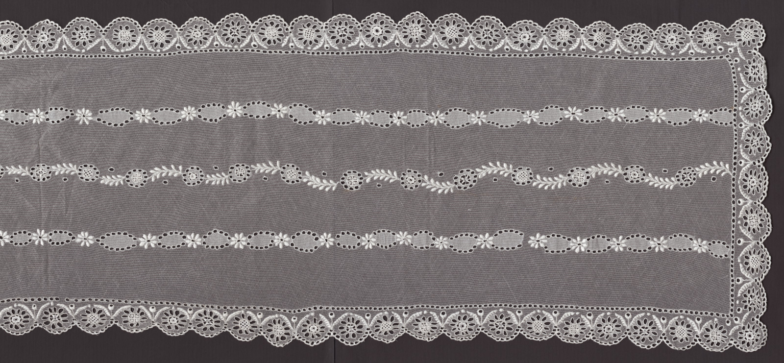 Biely tylový šál. Vyšitý je dierkovou a plnou výšivkou trnavského charakteru. Techniky: plný plochý steh, obnitka, dierky, gatre a slučkovanie. Motívy sú rastlinné štylizované.