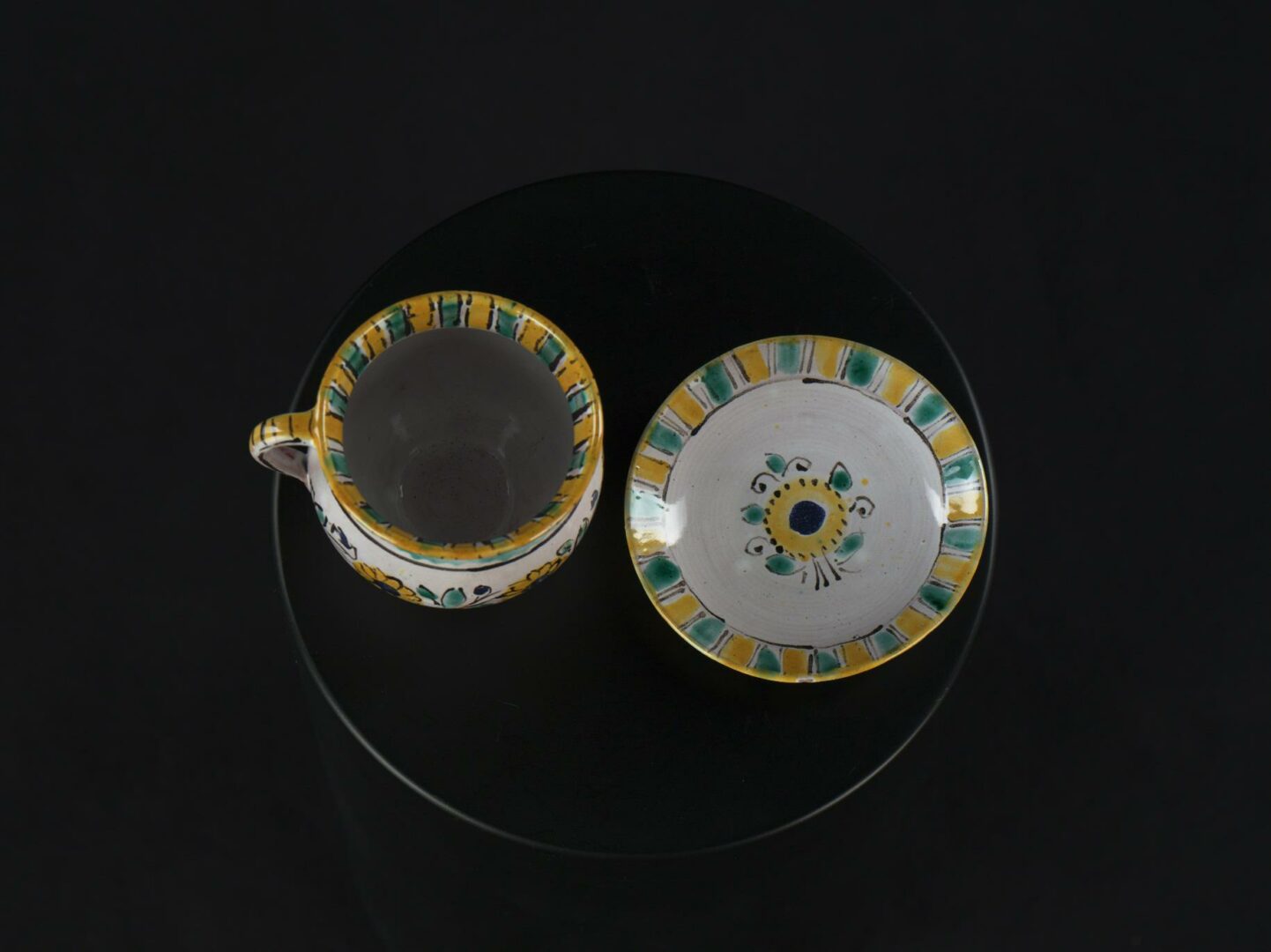 Tanierik a šálka z hliny, točené na kruhu. Šálka malá s uškom, tanierik malý plytký, hladký ako podšálka. Dekor: na dne tanierika kvet a okolo pásiky – geometrický dekor. Šálka – po obvode veniec zo slnečníc, na okraji pásiky – geometrický dekor. Farebnosť: modrá, zelená, žltá, kontúra. Biela podkladová glazúra.