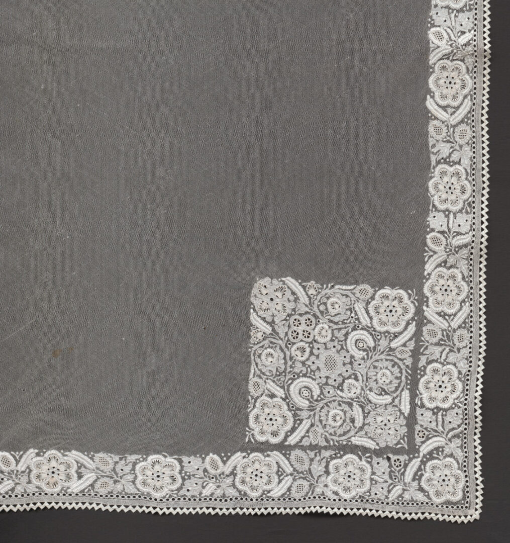 Šatka z tylu má v jednom rohu a na dvoch priľahlých stranách výšivku šitú bavlnenou priadzou. Výšivka je podkladaná tenkým plátnom. Plná a dierková výšivka je doplnená gatrami. Dookola sú prišité zúbky urobené z úzkej šnúrky. Na šatke chýba paličkovaná vláčková čipka.
