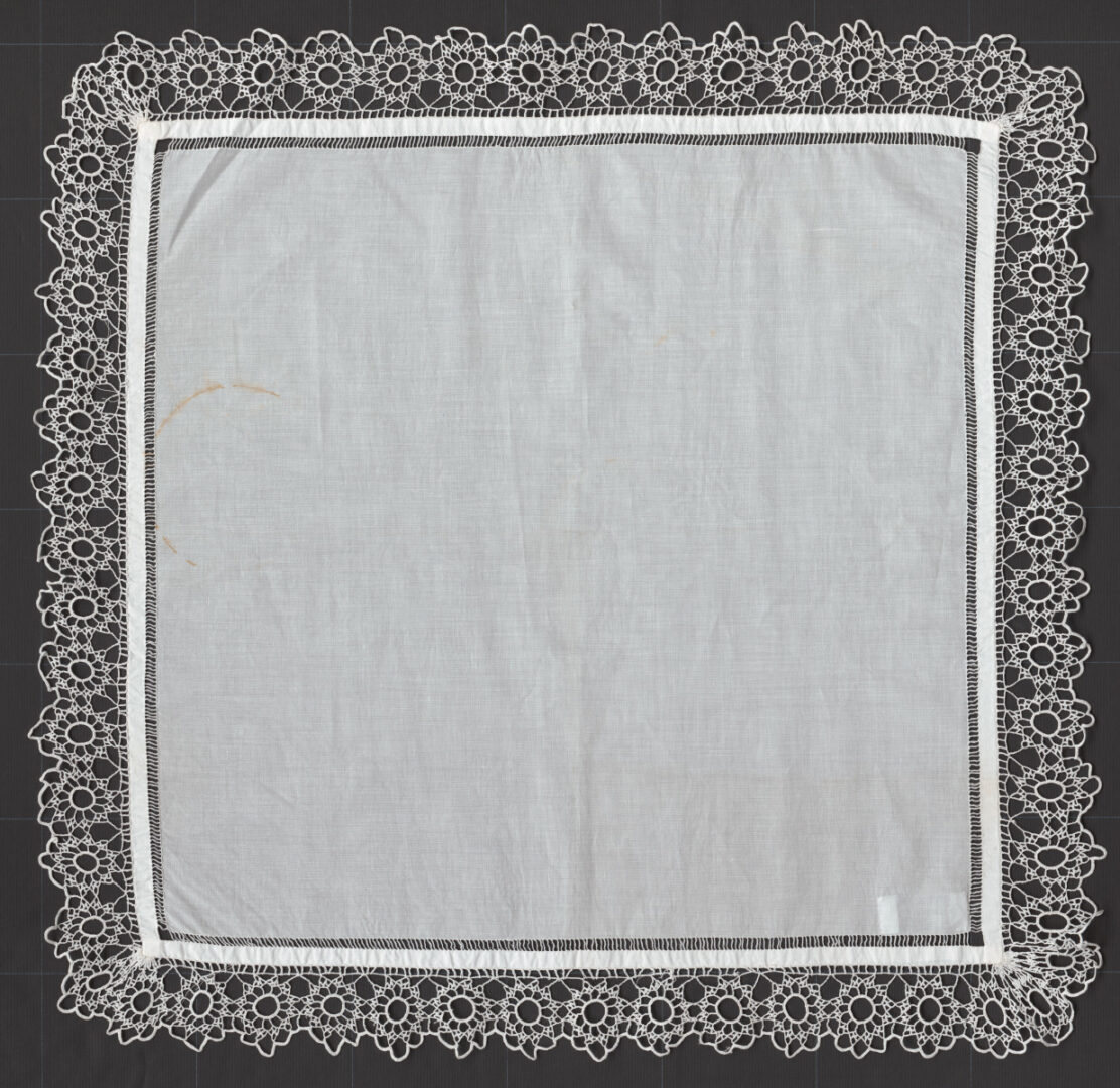 Okraje batistovej šatky sú zapracované ušitou ažúrkou. Dookola je šatka obháčkovaná čipkou.