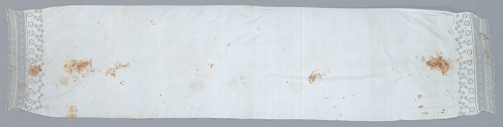 Šatka z tenkého továrenského plátna má na obidvoch koncoch plnú a dierkovú výšivku. Výšivka je šitá bavlnenou priadzou. K okrajom šatky je prišitá vláčková vložka a čipka.