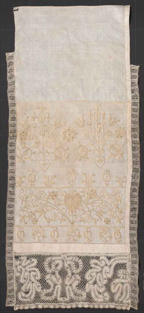Na tenkom ľanovom plátne je výšivka šitá nezosúkaným hodvábom. Výšivka je rozdelená na tri časti, v každej je rastlinný ornament vyšitý podľa predkreslenia. Základ je šitý plným plochým stehom, výplne sú urobené hladkovaním a dierkami. K okrajom, ktoré sú obrúbené ažúrkou, je prišitá paličkovaná čipka.