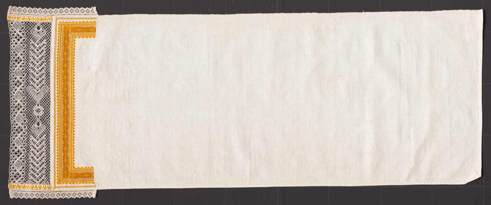 Časť šatky je z hrubšieho továrenského plátna. Na konci má vyšitú hrachovinku s linkami krokvičky, hladkovaných zúbkov a mešterky. K samotnému okraju je prišitá starohorská paličkovaná čipka. Jej konce sú začistené pásikom plátna, z líca aj rubu, cez pásik je vyšitá krokvička. Výšivka je šitá nezosúkaným hodvábom. Čipka je z tenkej a hrubšej bavlnenej priadze. Po oboch dlhých krajoch do výšky výšivky je našitá úzka továrenska bavlnená čipka.