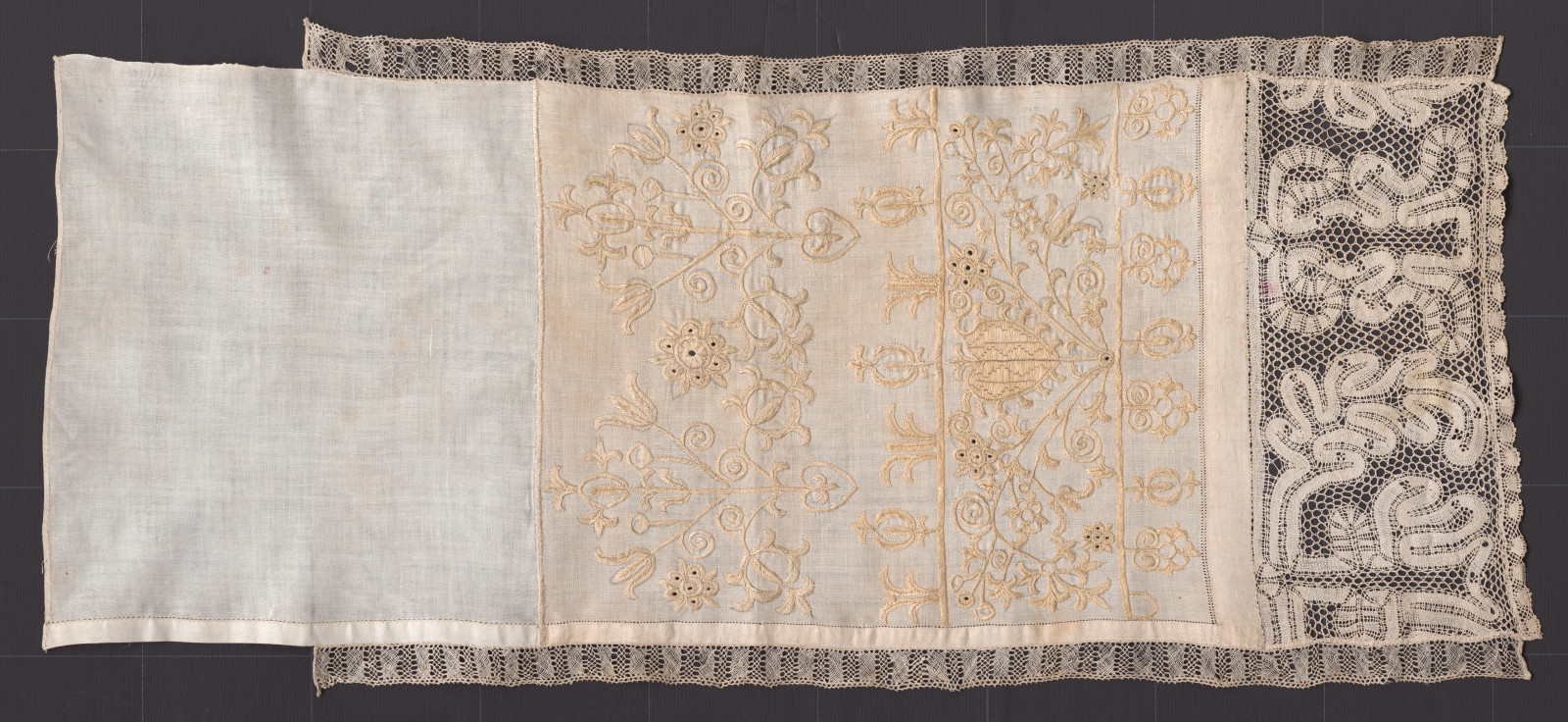 Časť dlhej šatky I – Na továrenskom plátne je umiestnená výšivka predkreslená, a podľa počítania nití je urobený 7 cm široký pás prelamovania. Prelamovanie je robené konopnou niťou. Miesta po vytiahnutých nitiach sú vyplnené gatrami. Predkreslený ornament je šitý nezosúkanou hodvábnou niťou, s použitím plného plochého stehu a gatier. Na konci je prišitá paličkovaná čipka, po oboch dlhších stranách je našitá úzka továrenska čipka. Na rubovej strane je prišitý textilný štítok s označením Hollósy Mária 208. Časť dlhej šatky II – Na tenkom továrenskom plátne je predkreslená výšivka šitá nezosúkanou hodvábnou priadzou s použitím plného plochého stehu. Na okrajoch je prišitá paličkovaná čipka, pravdepodobne z ľanových nití. Obidve časti pravdepodobne pochádzajú zo súkromnej zbierky Márie Hollósyovej z Cífera.