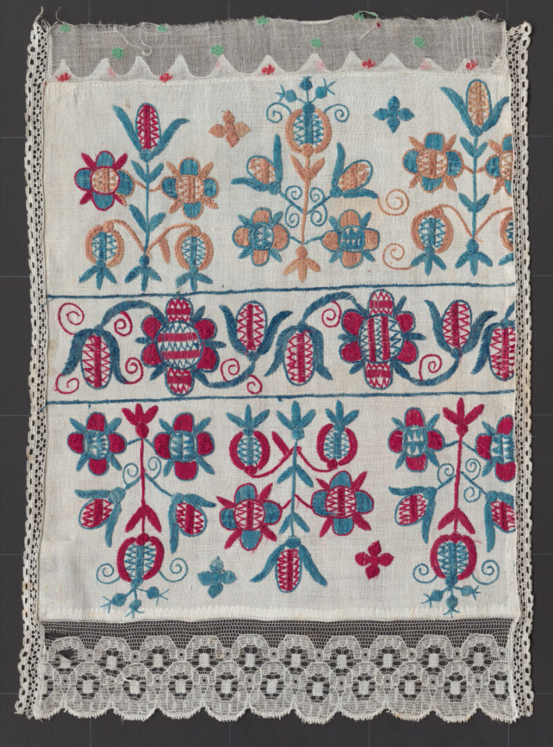 Časť dlhej šatky z továrenského plátna je vyšitá nezosúkanou hodvábnou priadzou. Predkreslený ornament je vyšitý plným plochým stehom. Z troch strán je našitá bavlnená továrenska čipka. Predpokladáme, že výšivka je zo súkromnej zbierky Márie Hollósyovej z Cífera.