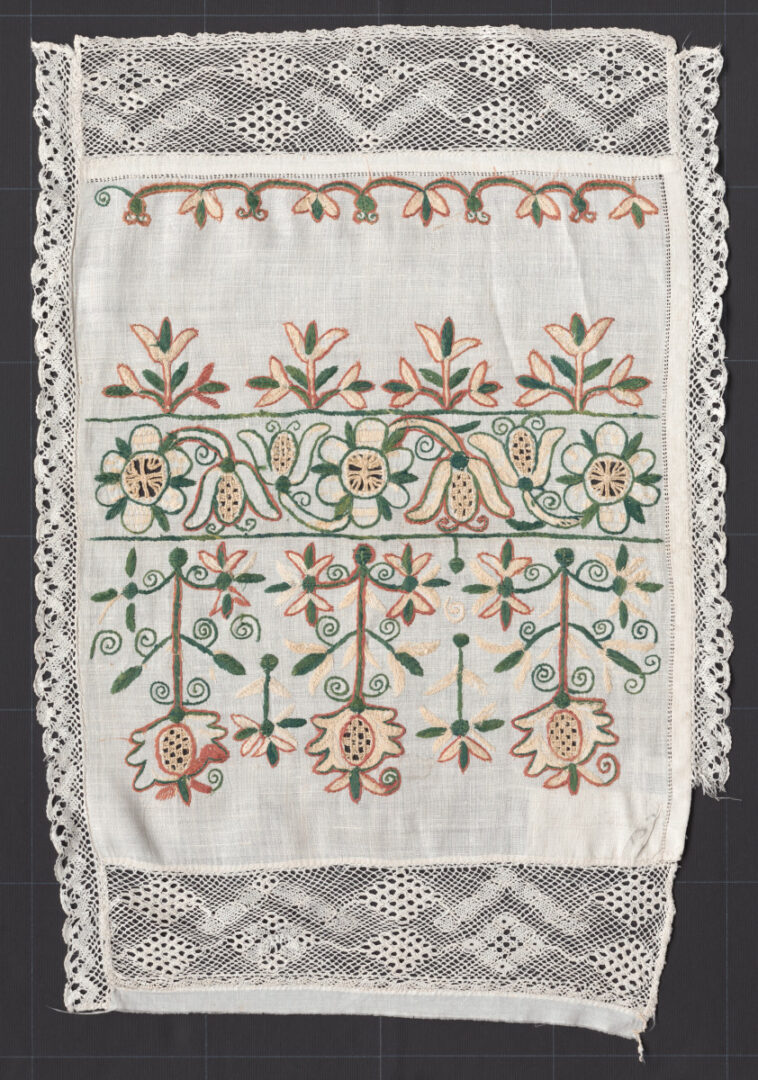 Koniec dlhej šatky z továrenského plátna je vyšitý podľa predkreslenia. Rastlinný ornament je šitý nezosúkaným hodvábom s použitím plného plochého stehu. Výplne niektorých motívov sú gatry. Dva okraje sú zapracované ažúrkou. K okrajom je prišitá paličkovaná čipka z bielej ľanovej priadze. Na rubovej strane je prišitá menovka: Hollósy Mária 76.