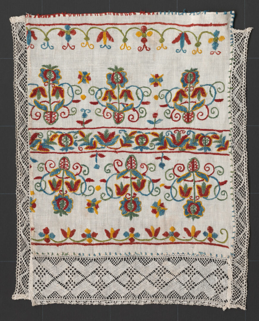 Časť dlhej šatky z továrenského plátna je vyšitá nezosúkanou hodvábnouo priadzou. Predkreslený vzor je vyšitý plným plochým stehom. Na kratšom okraji je prišitá mnohopárová paličkovaná čipka, na dvoch dlhších je paličkovaná čipka.