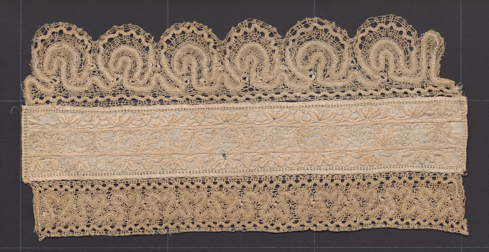 Časť dlhej šatky sa skladá z výšivky na továrenskom plátne a paličkovanej čipky, ktorá je k vyšívanej časti prišitá z dvoch strán. Výšivka je predkreslená, šitá retiazkou a plným plochým stehom. Šitá je zosúkanou hodvábnou priadzou. Paličkovaná čipka je pravdepodobne z nebielených ľanových a hodvábnych nití.
