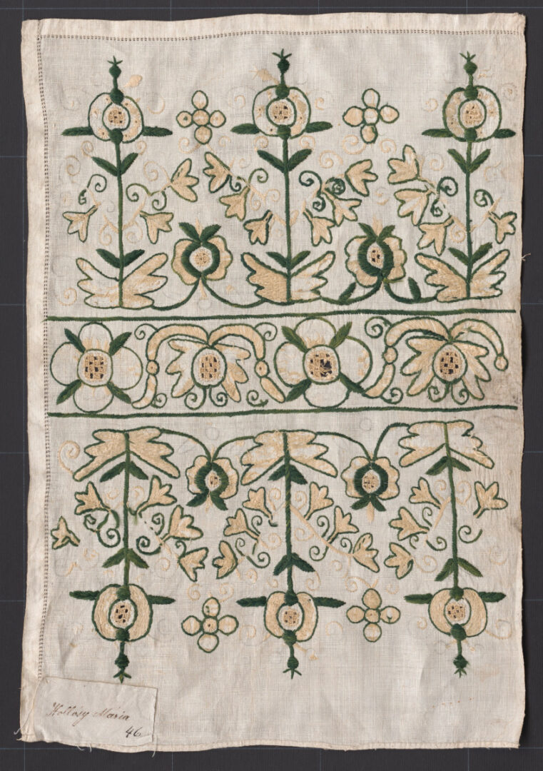 Koniec dlhej šatky z továrenského plátna má dva okraje obrúbené a zapracované ažúrkou. Výšivka je šitá neskrúcanou hodvábnou priadzou. Šitá je plným plochým stehom, niektoré motívy kvetov majú stred vyplnený výrezom. Veľká časť výšivky hodvábom je vypadaná. Na predmete je prišitá menovka : Hollósy Mária 46. Výšivka pravdepodobne pochádza zo súkromnej zbierky Márie Hollósyovej.